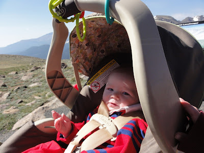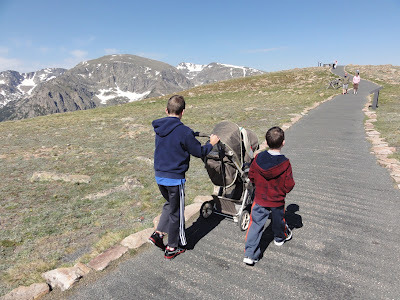 Owen, Elliot (in the stroller), and Max on the lookout for yellow bellied marmots. We always find marmots at the "alpine communities" stop on Trail Ridge Road.