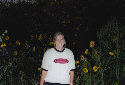 Yes, that's me, baby face and all, sniffing a sunflower. Look how non-grey my hair was back then. And no, sunflowers don't really have a lovely flower fragrance. To take the picture, Aimee asked me to climb a little mound and stand in the middle of the flowers. I paid for my compliance with tiny cuts and hives on my arms and legs. She framed my picture (the one above) and kept it on her nightstand until the day she died.