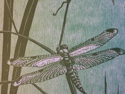(a woodcut of a dragonfly from UK artist Christine Howes)