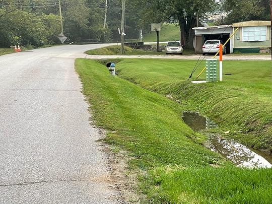 The ditch where I tried to “hide.” (The trailer in the background was not ours, but reminded me a lot of ours.)