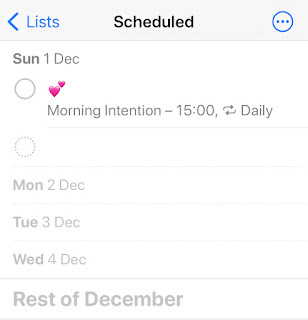 I’ve set my reminder for 15.00 daily (I know, the list calls itself Morning Intention), for the ENTIRE month of December. I’ve sent myself some pink love hearts to remind me to take a moment to reflect.