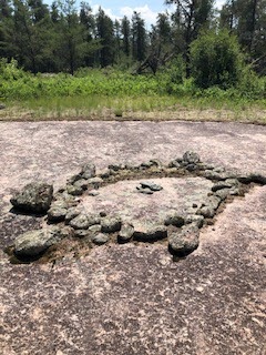 Only two other people were there the day we visited. They soon disappeared into the forest, so we found ourselves alone in this haunting and serene landscape. Surrounded by trees at the perimeter, we walked onto the stark rocks of the Canadian Shield, and wound our way through the endless trail of petroforms, stones intricately placed in the shape of snakes, turtles, humans and other forms. The sun beat down on us from a cloudless sky, but we took the time to stop and wonder at the mystery of the place and the people who had first come together here over 1500 years ago to carefully construct this amazing ceremonial place.
