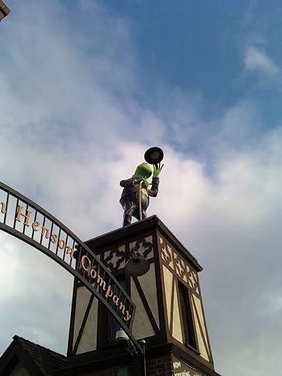 As you can see, as a tribute to Chaplin, there's a statue of Kermit in Chaplin's trademark derby and baggy pants just beside the entrance. Here's a somewhat better picture, taken from just outside the front gate: