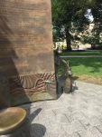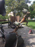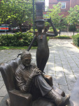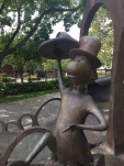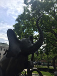 After wrapping up my time in Hanover, I drove 90 minutes south to Springfield, where Ted was born in 1904. Springfield is rightly very proud of its most famous son (and that’s saying something, as the town actually has quite a few famous sons and daughters), and it shows: all the signage for the Springfield Museums prominently features Seuss characters, and the complex itself centers on a fun sculpture garden featuring Horton, the Lorax, Thidwick, Sam-I-Am, and — sitting in front, with one foot up on a drawing table — Ted himself, being given a coy hat tip by the Cat in the Hat.