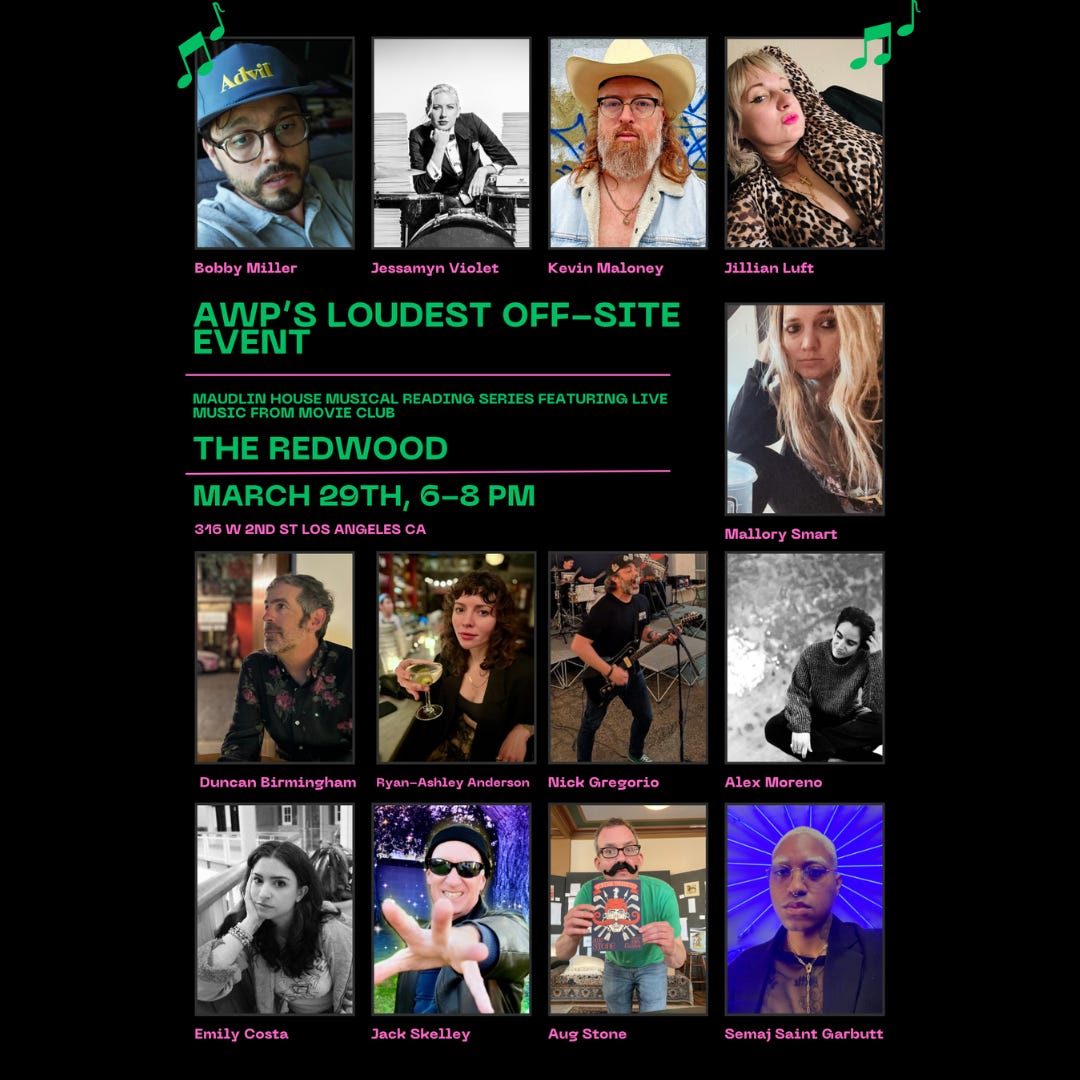 I’ll be reading with a bevy of talented writers this Saturday, March 29th 6pm sharp at the Redwood in Los Angeles. WITH A BACKING BAND. Details and RSVP here.