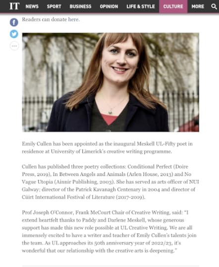 I am thrilled to share the news that I have been appointed Lecturer / Poet in Residence at the University of Limerick. My role will involve teaching Creative Writing, supervising postgraduate work, organising some literary events and personal creative writing projects. I cannot wait to start in the new Spring semester, 2022. I view the teaching of Creative Writing and mentorship of other writers as integral to my creative practice and literary citizenship and so this is a dream post for me. The inspirational poet-teacher, Theodore Roethke once observed that "teaching is an act of love, a spiritual cohabitation, one of the few sacred relationships left in a crass secular world" and I completely agree with him. I am truly looking forward to working with the Creative Writing students at UL and with the sensational team at the School of English, Irish & Communication. My appointment was announced in The Irish Times today.
