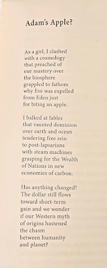 anthology (edited by Alice Kinsella and Nessa O'Mahony, Doire Press, 2021). "Adam's Apple" was inspired by the contrast between our Western myth of origins, which positions us as masters lording it over the Earth, and those of some First Nations peoples, whose beliefs have always been in much closer harmony with our planet. And how striking that one of our most famous economists in history was baptized 'Adam' Smith!