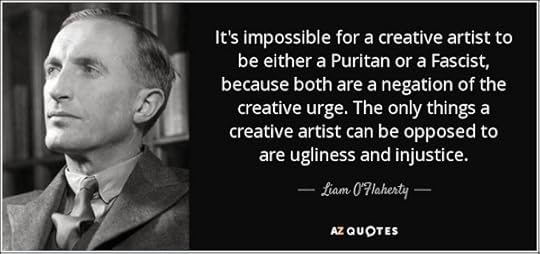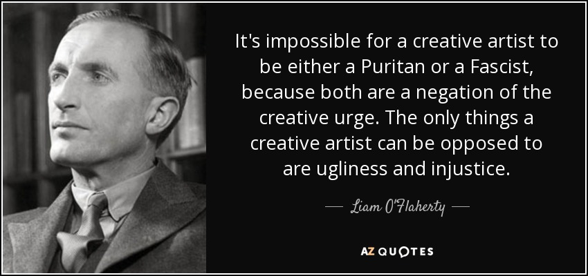 A famous quote of O’Flaherty’s that is all over the web and hints at the breadth of the man’s thinking can be read directly above. As well as suffering from the wrath of the censorship board, (he was one of the most censored writers in Ireland in the 1930s) O’Flaherty has, perhaps, also been unfairly disparaged by critics for his refusal to work within a completely realist mode in his novels. (He has been most widely praised for The Informer, Skerrett and Famine). I think this quotation hints at the expansiveness of his vision – something which has proven challenging for academics, who would too easily wish to pin down O’Flaherty and find that they cannot. As Dermot Heaney writes in his paper “The O’Flaherty Novel: a problem of critical approach”: “One cannot help feeling that many critics would prefer a lesser, more easily definable author, a tidier writer.” (1995, Etudes Irlandaises)