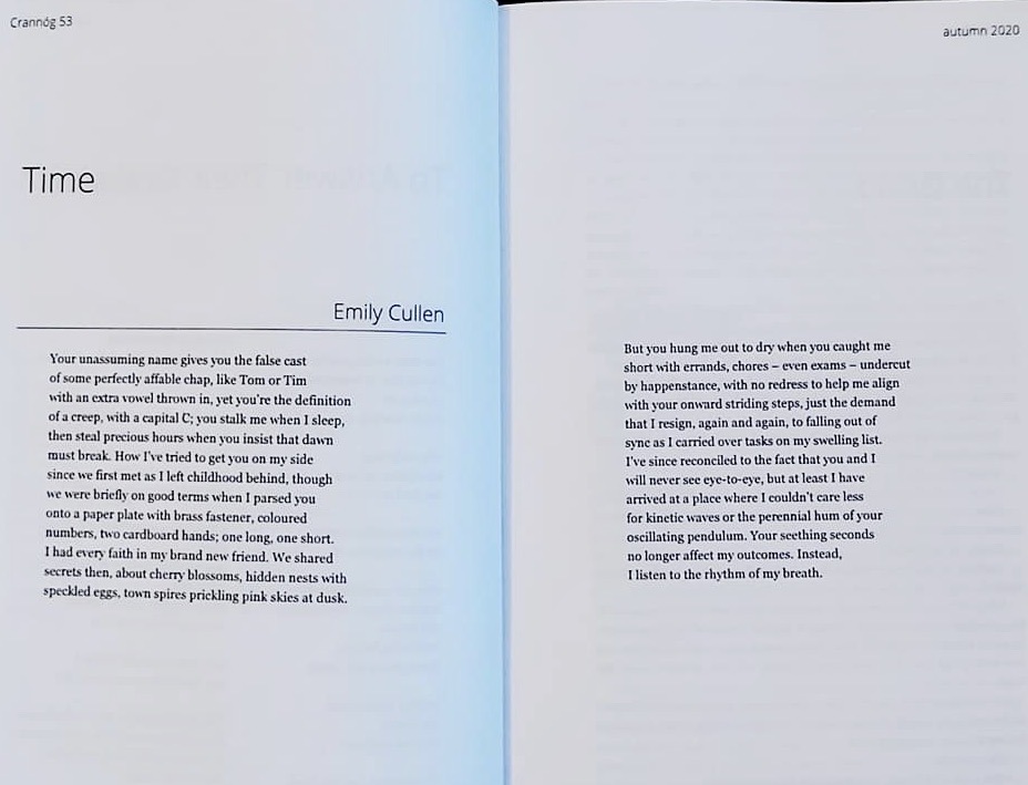 Because of the lockdown, there was no launch event for issue 53, but if you’d like to purchase a copy you can do so here. Below is my poem, “Time” which features in Crannog 53 and captures something of my ongoing turbulent relationship with the eponymous entity! I hope you like it.