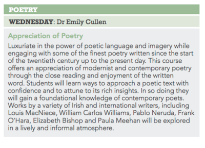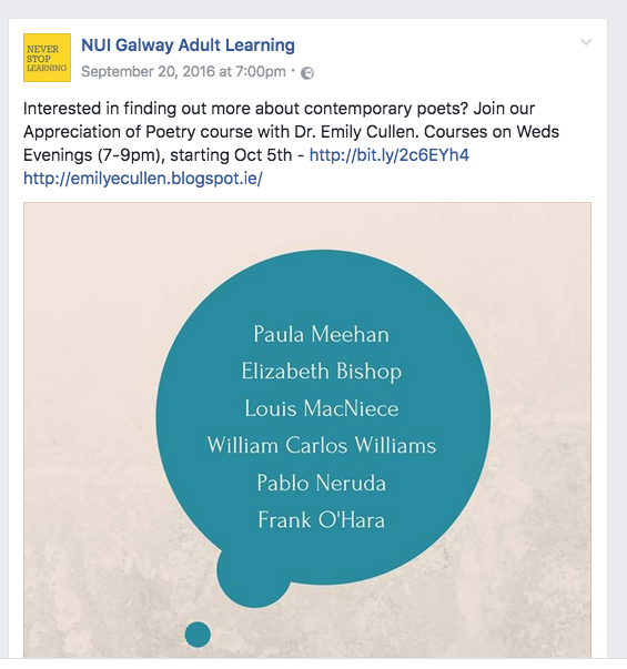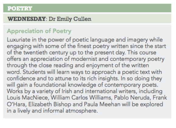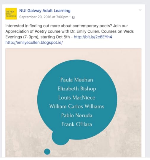 I'm really looking forward to getting my 'Appreciation of Poetry' course started in just over a fortnight, on Wednesday, 5 October. Themes will include: ways of understanding and reading a poem; how poetry is made; the sonnet; the villanelle and forms of rhyme; poetry in free verse; language and vision in ekphrasis; the haiku; image, nature and description; common things: poetry of the antipoetic and spoken word. We'll explore the work of the poets below as well as RS Thomas, Wendy Cope, Patrick Kavanagh, Lucille Clifton, Sylvia Plath & Bronwyn Lea. Only 10 days left to register! Contact berna.morgan@nuigalway.ie for further information and see page 10 of the Short Courses booklet: http://www.nuigalway.ie/…/fil…/Short-Courses-Series-2016.pdf See also my last post with full details.