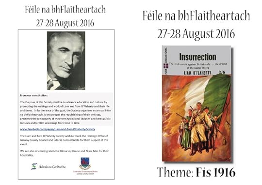 I've been sharing information and articles about the Féile over the past few weeks on other social media and hope to write a future blog post about O'Flaherty's writings. If you haven't already done so, this is the year to read his novel, Insurrection , which was first published in 1950. This gripping work of fiction focuses on Connemara man, Bartly Madden, who returns from England to Dublin at the outset of Easter Week 1916 and gradually finds himself caught up in the Rising.