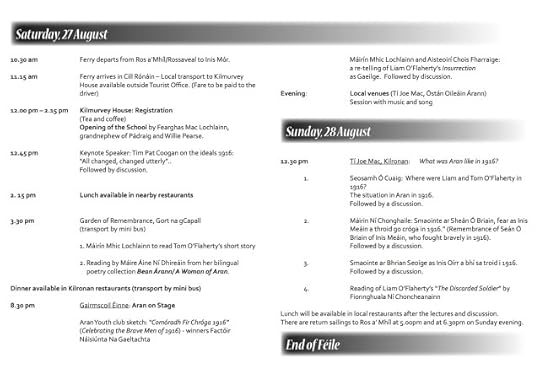 As an admirer of Liam O'Flaherty's writings and as a committee member of the Liam and Tom O'Flaherty Society, I am delighted to announce that the fourth Féile na bhFlaitheartach takes place on Inis Mór this weekend. See below for the full programme and please consider joining us for another memorable weekend of readings, music, drama, good chat, craic and debate. Note that the ferry departs at 10:30am each morning.