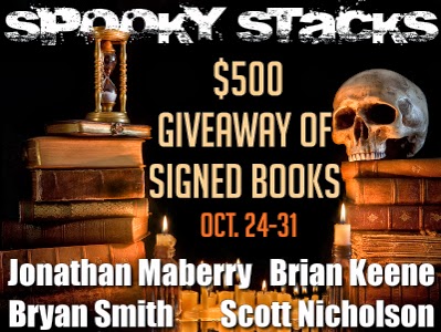Win $500 worth of signed books from bestselling horror authors Brian Keene, Jonathan Maberry, Scott Nicholson, and Bryan Smith! The SPOOKY STACKS GIVEAWAY runs from Oct. 24-31. Be sure to pick up your free copy of the Spooky Stacks ebook in all formats at Smashwords. Enter daily at their web sites!Brian Keene Website Facebook TwitterJonathan Maberry: Website Facebook TwitterScott Nicholson Website Facebook TwitterBryan Smith Website Facebook Twittera Rafflecopter giveaway