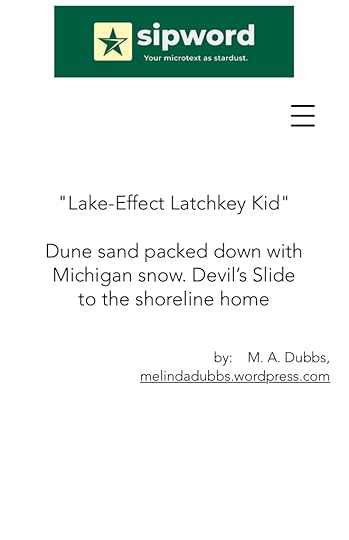 My haiku, “Lake-Effect Latchkey Kid”, was published on micro-text site sipword. For those unfamiliar with the site, sipword publishes micro pieces of verse or prose (less than 300 words) for only 24 hours. sipword also offers a great payment rate of $10 for your piece. Check them out and consider submitting your own work: https://www.sipword.com/