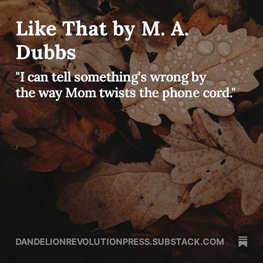 My short fiction story “Like That” was published today with Dandelion Revolution Press. You can read the piece on their Subtrack . This flash is a coming-of-age story and the transition out of childhood after a death in the family. It also explores the avoidant language we use with children and the impact on them.