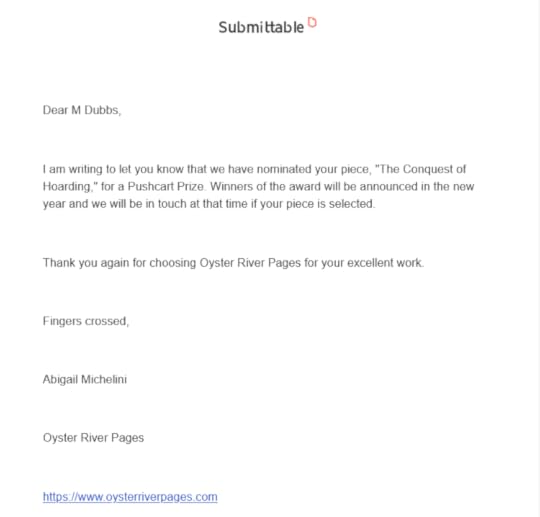 I am incredibly humbled and beyond thrilled to announce that my poem “The Conquest of Hoarding” has been nominated by Oyster River Pages for a Pushcart Prize. The Pushcart Prize is an honored award to receive in literature for any writer. I definitely cried happy tears when I read the email this morning and I’m still in shock and disbelief! My fingers are crossed to hear back from the final announcements but just being honored is a great privilege.