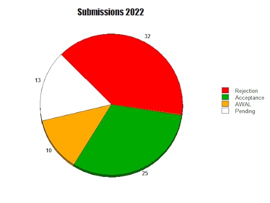 As you can see, rejections make up the biggest percent (in red), while rejections follow behind (in green). The orange is AWAL, meaning publications that have become defunct or there’s radio silence on all platforms from them. I always have a few of these each year, often from smaller and newer publications but not always. Lastly, in white are submissions that are still pending and I haven’t heard back from yet.