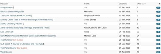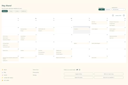You can quickly find out if they have open calls, how long you’ll wait, and if they pay (and that’s really the majority of the information I need). Like Duotrope, they also have a calendar for upcoming deadlines (which I think looks much better).