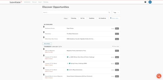 Although more visually appealing than Duotrope, I do frequently find inaccuracies. So many times I will click “no fees” for submissions only, after clicking the call and reading paragraphs of information, do I see the submission fee. The Discover tab has frequent tags such as “haiku” or “flash fiction” but they are limited (also, someone tell me why “tequila” is an option? This apparently is an untapped topic for future writing). I do like that you can save a submission for later.