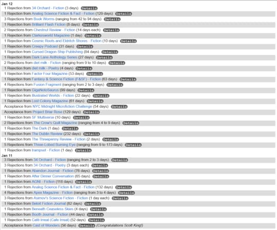 Next up, we have The Submission Grinder (now just called The Grinder). It’s a no frills manager that helps you track what you submitted and how long it’s been out. You can also see public data on who is hearing back from who. You can literally see when magazines are sending out mass rejections (and take solace) or even toot about your own acceptance success.