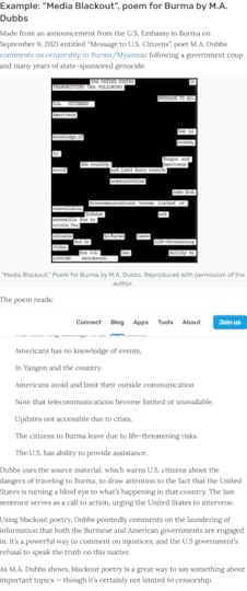 Live today on Reedsy Blog is an article and analysis of my blackout poem “Media Blackout”. I was approached by a Reedsy writer to use my piece in their blog and was beyond thrilled to 1. meet a fellow blackout poetry fan and 2. have the poem gain new life! The article discusses the history of blackout poetry and some common themes. “Media Blackout” is discussed when exploring the use of blackout poetry to bring light to censorship and oppression.