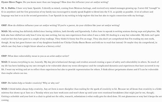 I did a contributor interview with Oyster River Pages and it is now live on their website! I talk about how my mixed Hispanic heritage, becoming a mom, and the use of writing routine all impact my writing style and art.
