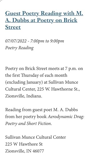 This Thursday I was honored to be the featured author at Poetry on Brick Street! I read from my debut collection Aerodynamic Drag: Poetry and Short Fiction (2021). It was a wonderful night with a very welcoming audience followed by a stunning open mic.