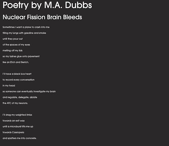 I have four poems out today and published with for their online magazine. Spoonie Press publishes writing focused on disabilities and/or neurodivergence. All the pieces are about my personal experience with neurodivergence. Read “Nuclear Fission Brain Bleeds”, “The One Where I Have a Panic Attack”, “Formerly Content with SSRI Flavor” and “Gaslighting Anonymous” here: https://www.spooniepress.com/magazine/ma-dubbs-poetry-072022