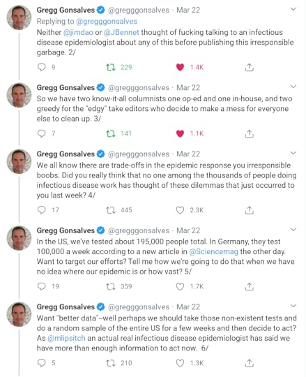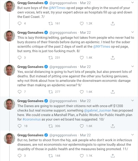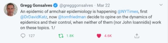 And it gets worse with — surprise, surprise — Bret Stephens, who took the same contrarian path, questioning the experts and their “models” — yes, he put “models” in scare quotes. He based his arguments in great measure on a piece by John P.A. Ioannidis — which I had already seen the expert doctors in my Twitter list excoriate. Here is a very polite takedown of Ioannidis’ theories by Harvard’s Dr. Marc Lipsitch, who concludes: “Waiting and hoping for a miracle as health systems are overrun by Covid-19 is not an option. For the short term there is no choice but to use the time we are buying with social distancing to mobilize a massive political, economic, and societal effort to find new ways to cope with this virus.”