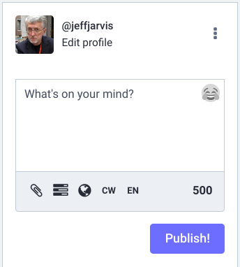 Now, finally, to the important part: writing. In that first column, you’ll find the box for that purpose. On most Mastodon instances, the character limit is 500 — generous next to Twitter’s 140 then 280. Some servers up that to 1,000; I have so far resisted the temptation to migrate there.