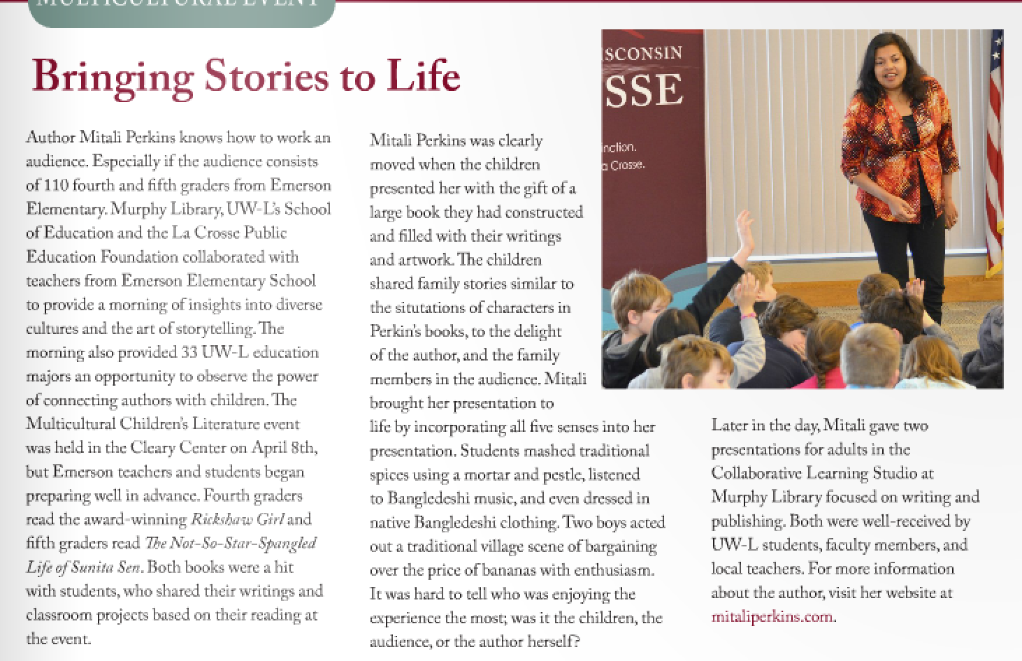 for a long time, and the children seem to grow more endearing by the year. The University of Wisconsin's School of Education recently invited me to speak to fourth and fifth graders at Emerson Elementary in La Crosse. In this nice writeup describing my presentation, the School of Education's newsletter asks a good question: "It was hard to tell who was enjoying the experience the most: was it the children, the audience, or the author herself?"