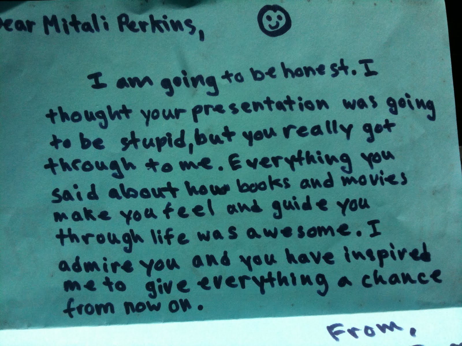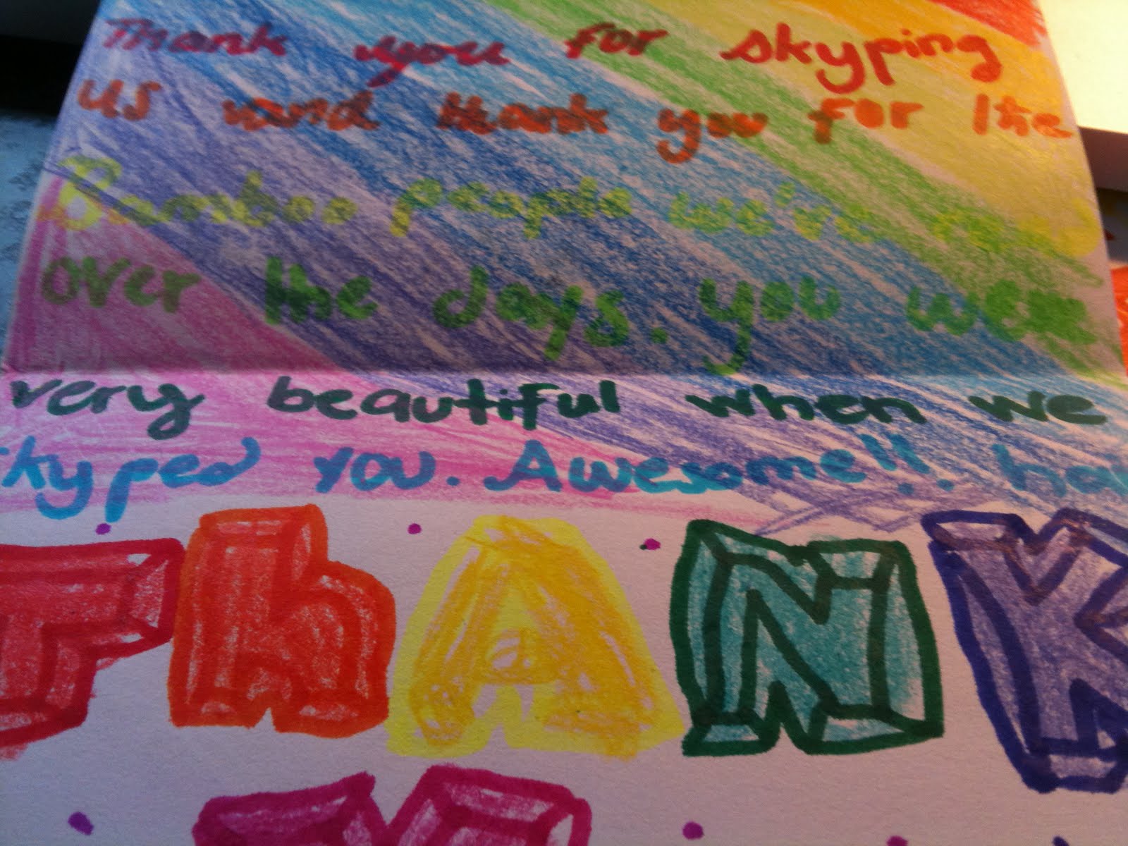In case you can't read it: "...You were very beautiful when we skyped you. Awesome ... hair."