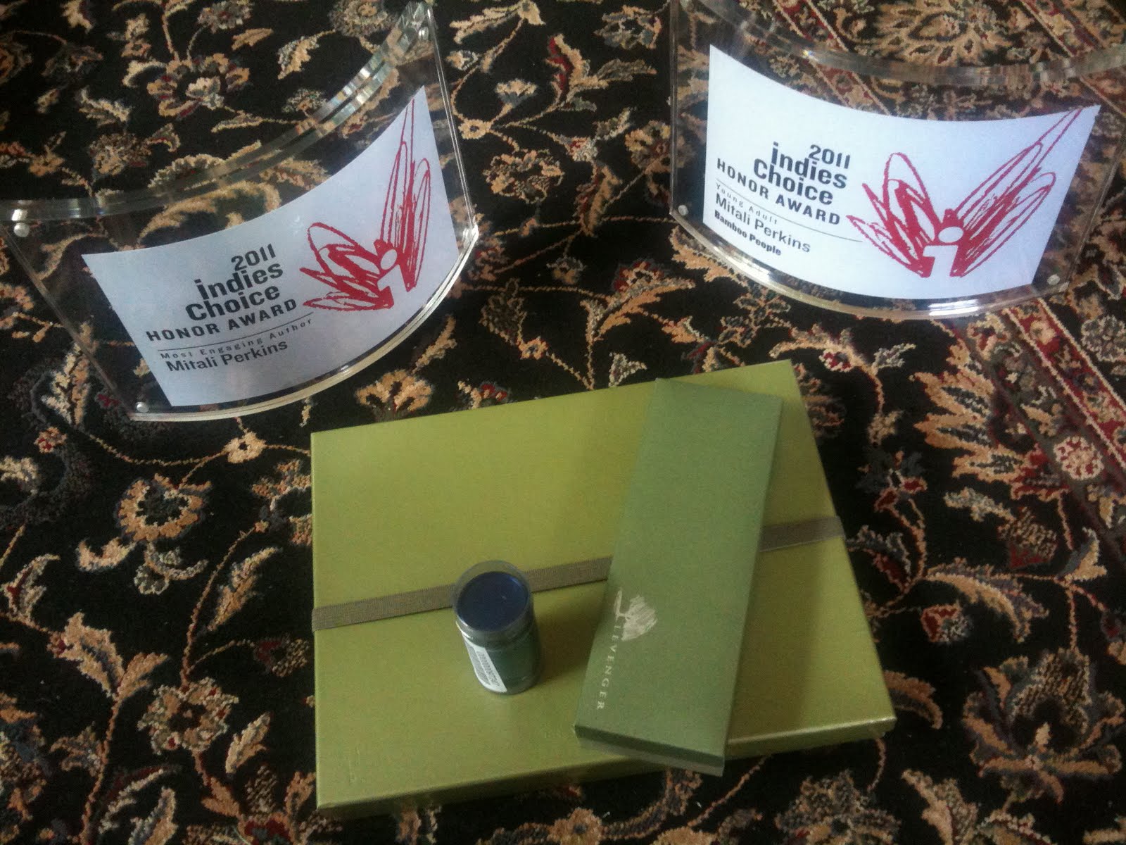 At home, I unwrapped my goodies: a gorgeous Levenger pen and notebook and two award plaques, one honoring BAMBOO PEOPLE in the YA category and one honoring me in the Most Engaging Author category. (As Lisa Yee tweeted, it's a lot better than being known as a Most Enraging Author.) Thank you, booksellers! I've loved you for years, but knowing it's not unrequited feels fabulous.