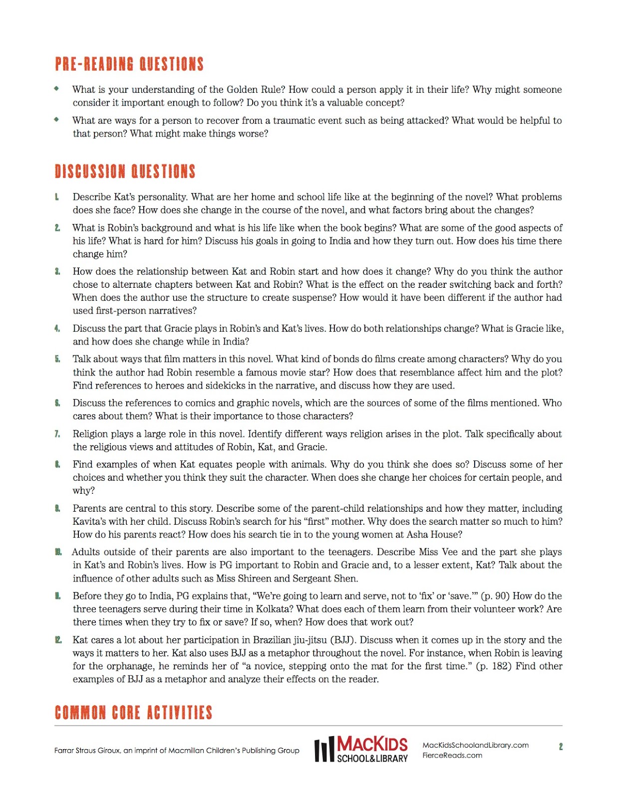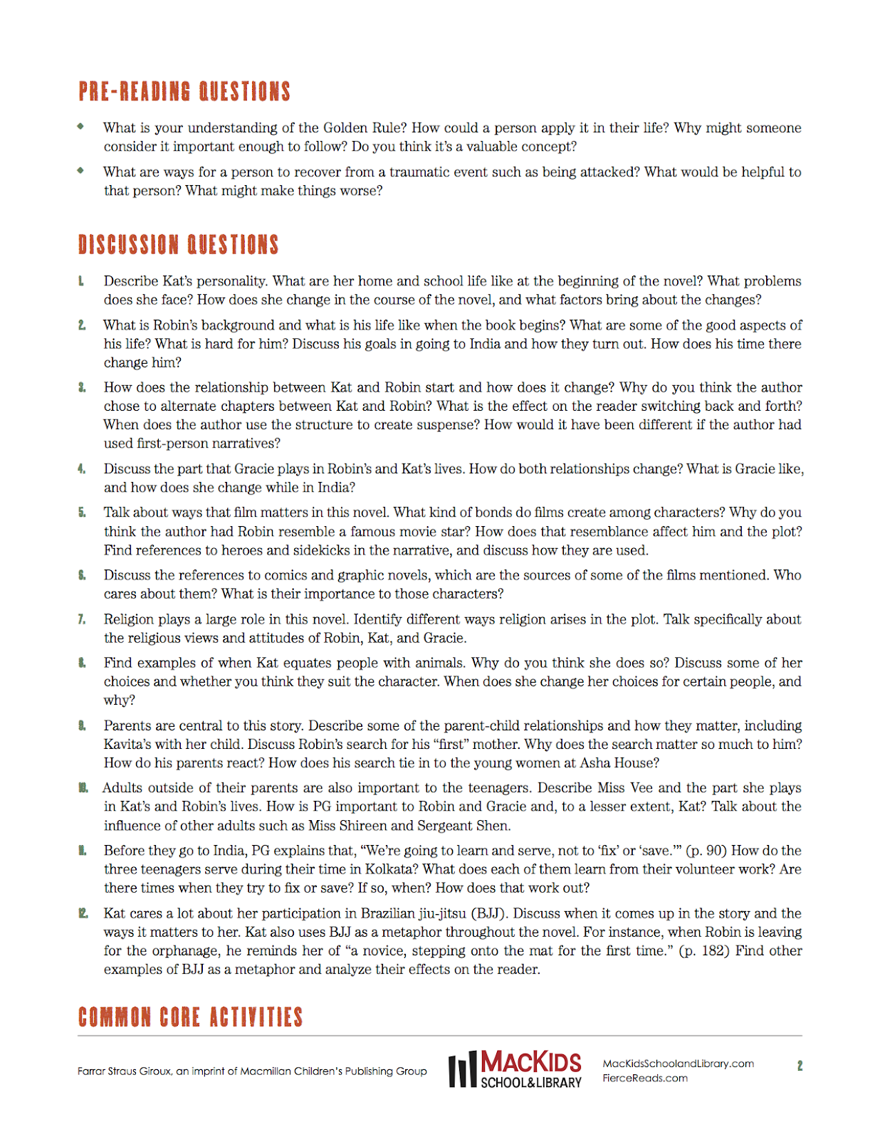 PG asks Kat, Gracie, and Ravi to answer two questions about their service trip before they go. “I want to…” “I hope to …” Finish the sentences for yourself and seal in an envelope to read when you return.Why was it important for Ravi, Kat, and Gracie to study Bangla? Do you plan to learn any words or phrases in the language spoken by the people you are visiting? If so, how? If not, why not? Gracie, Kat, and Ravi follow the lead of the national/local people who welcome them for the summer. Ravi spends time on what he thinks will be boring office work and Gracie and Kat agree to take care of babies as their “act of service.” Sometimes a good desire to serve and give can end up damaging local systems instead of supporting them. Did this happen with Kat, Ravi, and Gracie? Why or why not? What will you be doing as your “act of service”? Is your labor something that could be done instead by local people who need the income? If you are bringing stuff to donate, how does this affect local vendors and producers of similar food or wares? Is your act of service regulated by laws and offered only by trained professionals in your own community? How would you feel if someone came in and served your community in the same manner?Why is Sergeant Shen mistrustful of foreigners visiting his work? Why does Arjun think it’s important? Do you agree with Shen or Arjun?Kat and Ravi both hope to “save” the victims of human trafficking. What are their plans? Why don’t they work? How are people in the novel helped and by whom?What do you think about the “no cell phone” policy PG sets in place during the summer? What are the risks of posting on social media while serving overseas?Do you think the fact that Kat, Ravi, and Gracie aren’t white makes a difference during their time in India? Why or why not? Does the history of British colonialism play any role in how white people might be perceived in India? Does our perceived ancestry (correct or incorrect) matter in cross-cultural service?