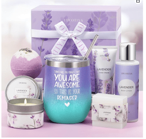 What's in the box:1⃣ 20 oz Insulated Wine Tumbler | 2⃣ Silk Eye Mask | 3⃣ Fuzzy Socks | 4⃣ Sunshine Stress Ball | 5⃣ Elastic Hair Scrunchy 6⃣ Inspirational Keychain | 7⃣ 7oz Blue Wind Chime Scented Candle | 8⃣ Bath Bomb | 9⃣ Oatmeal Soap Bar |