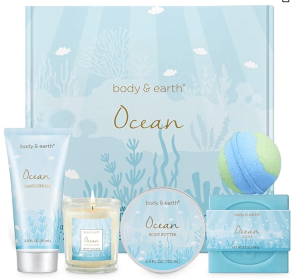 Set includes scented candle, body butter, hand cream, hand soap, bath bomb.