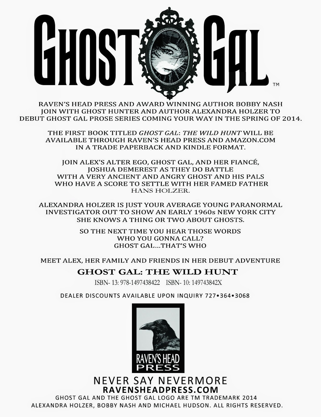 unused coverRAVEN’S HEAD PRESS AND NOTED AUTHOR BOBBY NASH JOIN WITH AUTHOR AND GHOST HUNTER ALEXANDRA HOLZER TO DEBUT GHOST GAL PROSE SERIESRaven's Head Press is proud to announce an exciting new series debuting in 2014.Noted author Bobby Nash and Raven Head Press’ Michael Hudson have agreed to develop Author and Ghost Hunter, Alexandra Holzer’s GHOST GAL as a fictional series of novels based on her exploits as a budding parapsychologist.