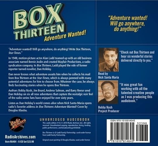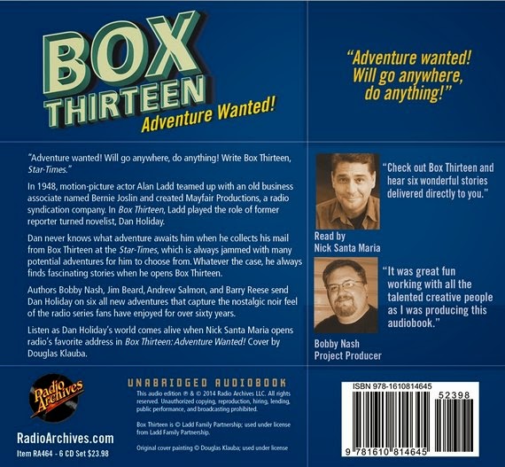 CD Back CoverRadio Archives has released the audiobook for the new Box Thirteen “Adventure Wanted!” In addition to having three stories in this collection, I also served as the Project Producer on this one, which was a first for me. Of course, these things don’t happen in a vacuum so I’d like to thank writers Jim Beard, Andrew Salmon, and Barry Reese for joining me. You can’t ask for a better writing team. Also, big thanks to Nick Santa Maria who brought them to life and to Doug Klauba for that beautiful cover. Also thanks to John Olsen and to Tom Brown at Radio Archives for putting it all together. This title is available on audio CD, audio download, and ebook.You can find Box Thirteen - Adventure Wanted! here.