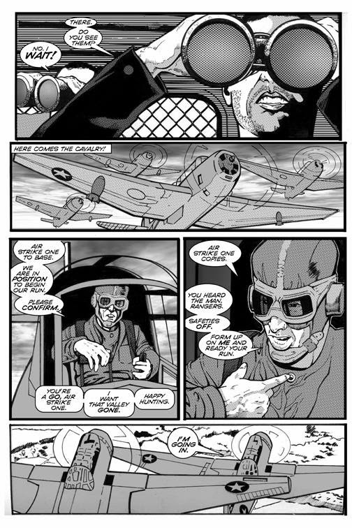 Operation Silver Moon is a graphic novel project currently in production and written by Bobby Nash with art/tones by Rick Johnson. In this sneak peek page from the book, set during World War II, a certain group of air aces makes a cameo appearance. When an air strike is called in over hostile territory, the War Department sends in their best pilots-- The Sky Rangers, under the command of Captain Lance Star."I can't say enough great things about Rick's art or the man himself," said Bobby Nash of his collaborator on this project. "Rick has been a great partner on this project and has become a great friend in the process. I'm excited to unveil Operation Silver Moon in 2014."