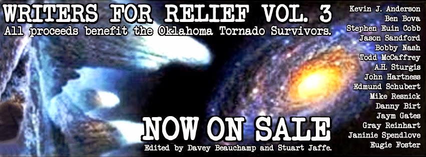 The Writers for Relief anthology series feature collections of short fiction by top talents in the realms of fantasy and science fiction writing. The first and second volumes have brought help to Hurricane Katrina survivors through the Red Cross and Bay Area Food Bank, respectively. This third volume turns the focus to those who suffered in Oklahoma and features some of today's best known speculative fiction authors including Kevin J. Anderson, Ben Bova, Stephen Euin Cobb, Jason Sandford, Bobby Nash, Todd McCaffrey, A.H. Sturgis, John Hartness, Edmund Schubert, Mike Resnick, Danny Birt, Jaym Gates, Gray Reinhart, Janinie Spendlove, and Eugie Foster.