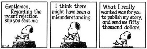 Snoopy knows the pain.Q: Could you recommend a company friendly to comic script submissions?Sadly, there aren't really many (if any) comic publishers out there looking for script submissions. These days, most want to see a finished comic, drawn, lettered, and colored. Most want to read a published comic you wrote to see how you write and from there will decide if they want to see more work from you.