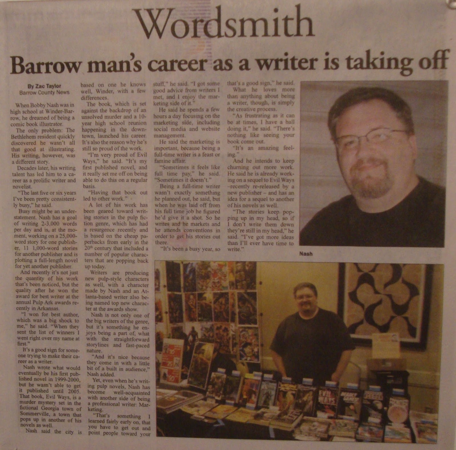 I love that headline.I was interviewed by reporter Zac Taylor for my local county newspaper, The Barrow County News, back on July 10th, but I didn’t actually get my hands on a copy until today. I don’t have a scanner handy so hopefully the photo will be readable at full size. Click the image for a larger view.Thanks to Zac for the interview and to his editor for suggesting it. I appreciate it. I also love that headline.