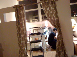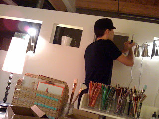 Back from Christmas in Connecticut, on the heels of a blizzard, and right to work on the new studio. It's day three and it's really coming together! I am trying to contain my spastic glee, can't wait to make art in this new little space! Here's a peek inside: