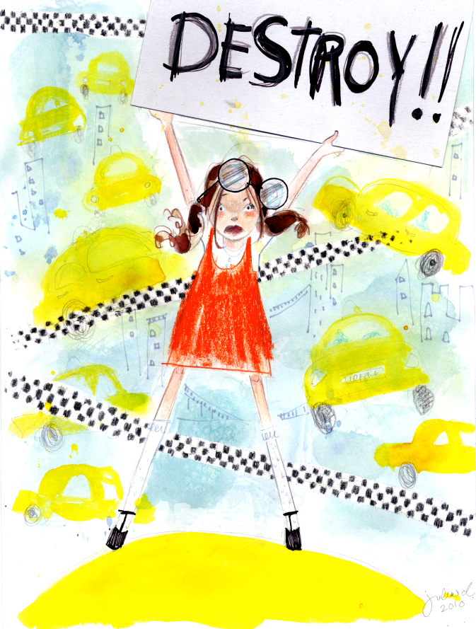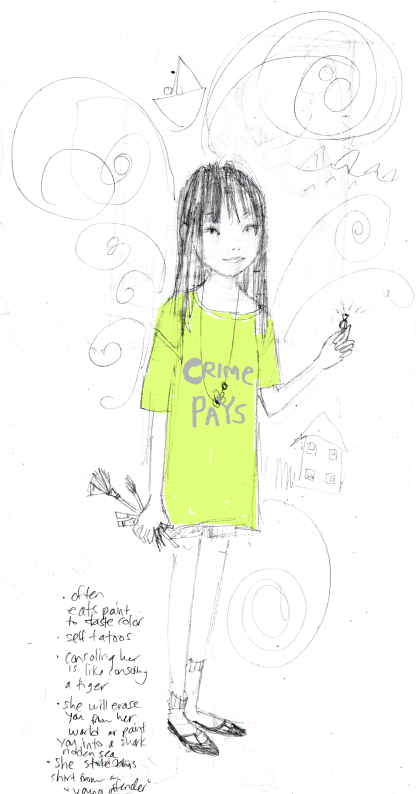 Wild (and Permanent) Rose Casson wormed her way right into my heart. She is the youngest of the Casson children: fierce and vulnerable, passionate and real (sort of reminds me of the rose in the Little Prince, if the rose were a little girl, of course!) She has her own blog. She is also a blossoming artist, creating murals on the kitchen walls, tagging along to her artist mother's "young offenders" art class for misguided youths (where she steals her infamous "Crime Pays" tee) She holds grudges, will not wear her glasses since she prefers to see the world slightly blurred, eats paint to taste color. Rose Casson is fab. Here's a sketch I did of her on my own time (click to enlarge):