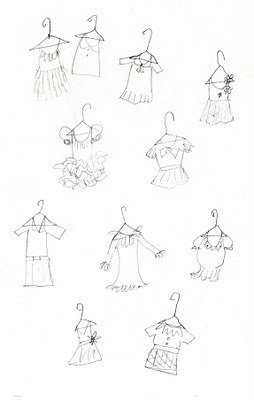 Right now, I'm working on visual concepts for a new book, I Had A Favorite Dress, by Boni Ashburn. To get in the mood, I've been doodling dressy things on hangers...Hope you are having a swell Thursday (it's so foggy here I can't even see the little hills out my window!)