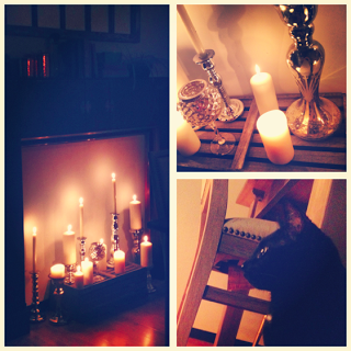 As far as seasonal nesting, my eyes always return from break fixed on pattern and color. I've been aiming to surround us in delft blue and Scandinavian pattern. I love how pattern can turn a corner into a "place" with a story of its own. Another domestic-cozy goal has been to create a homemade "hearth" for folks to sit around. We started to bring it to life this week (and escaped a fire emergency!) At least I can pretend it's the real thing. Isn't it neat what a little dancing flame can to a dark room (and cat)?