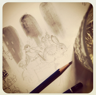 I also become slightly non-verbal in final art mode, it's strange. For days, my eyes and hands converse via line, shape, and value. In my head it sounds a little like this: "WIDE GREY THING, CHALKY EDGE THERE, SPLATTER!, BRING THE DARKS OUT, MUTE WITH OPAQUE, DEFINE LINE." Like a render machine. Am I making sense? No? Have some toast...