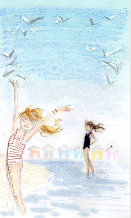 I used mostly pan pastels on the cover for color, pencil, colored pencil, crayon, and watercolor for render. I wanted the sea and sand to feel dry and textural. I ended up lightening the entire piece under Amy and Donna's direction to achieve a little more "hopefulness" and wonder...though it is a dark story, there is undeniable youth and life surging through and I understand their direction on that.