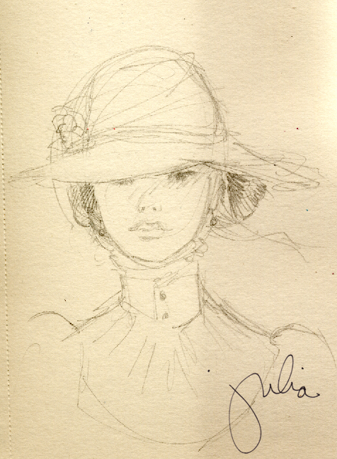 I just came across this lady again and thought I'd share. I sketched her in an airplane. She exists in a completely different time and universe than Ms. Cerulean in the previous post, right? An example of the two roads my art's been wandering down...the historical/sartorial coin is always flipping...