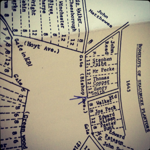 Once through the snow-sun-squall, we set off to finally find our Smith land! I held my new iPhone 4s GPS map against the blurry wiggly one dated 1643 and got ourselves to the precise location on Bishop Ave. where he settled at the " the Ring of the Green ", after it was freshly purchased from chief Massasoit , part of the Bay Colony in 1643. We were a little saddened, but as expected, nothing still existed to shout out the historical importance of this place. (It was a defunct bakery, which only amplified sadness....nary a cookie in sight!)
